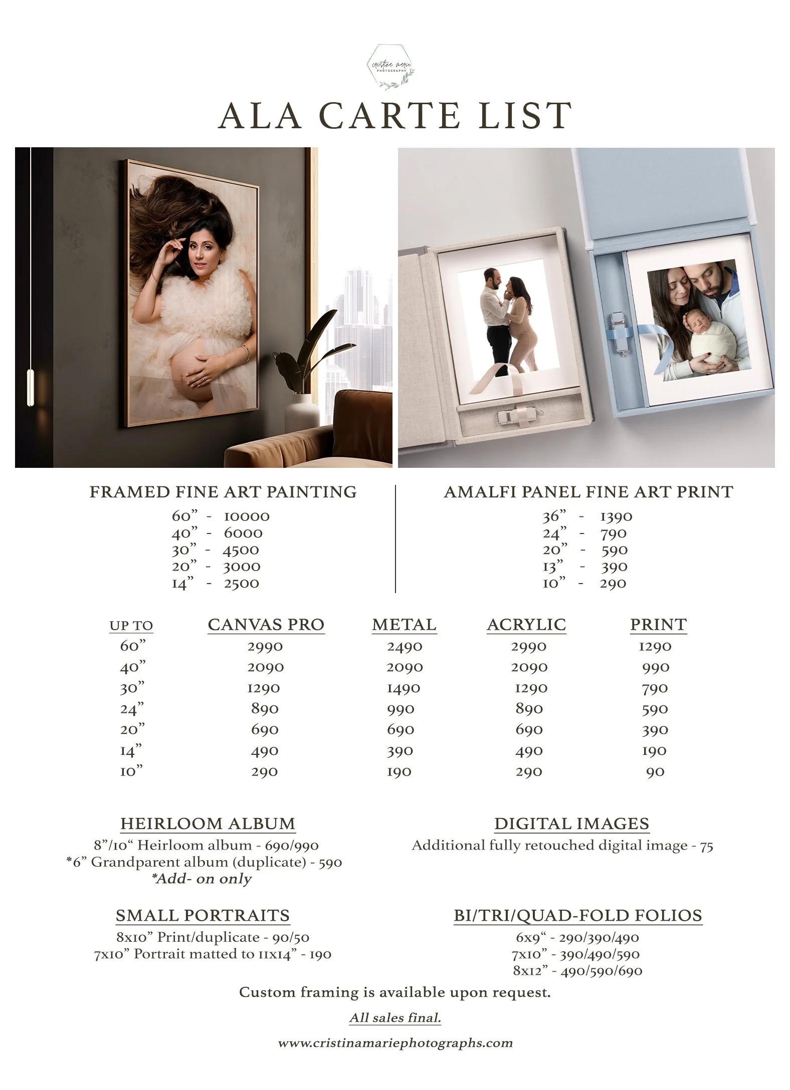 The best part of the custom portrait experience is showcasing your family’s portraits throughout your home. This page will introduce you to the several well-curated collection options and heirloom quality products offered by Cristina Marie Photography LLC. Each product was hand-selected to display your portraits in your home to look back on for years to come.